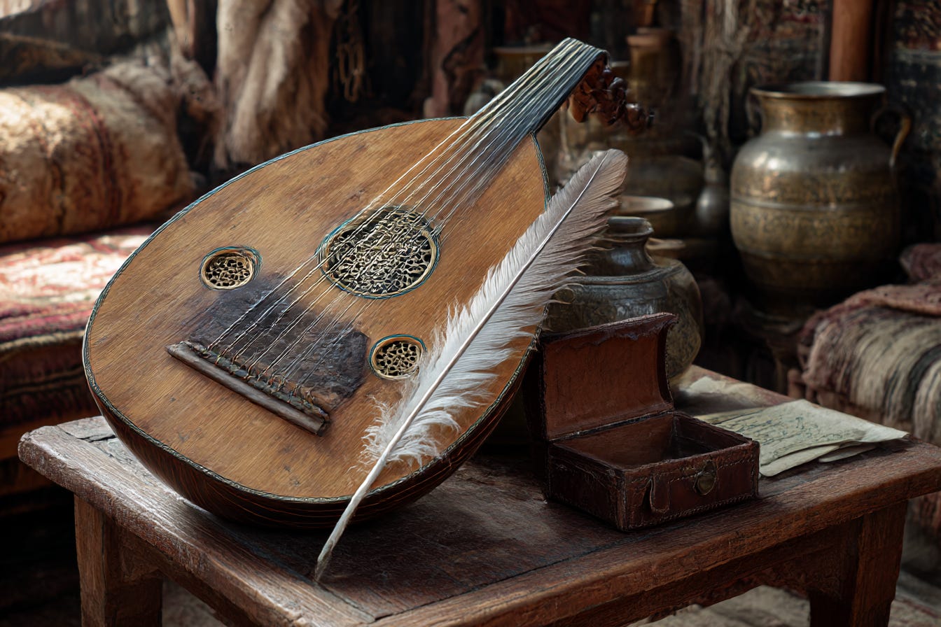 When the King returned, the sisters snatched up their jewels and silks, but the youngest took her small, plain box to her chamber and set it aside. Several days later, she looked inside to discover a miniature oud of dark, polished wood. and a single, delicate feather.